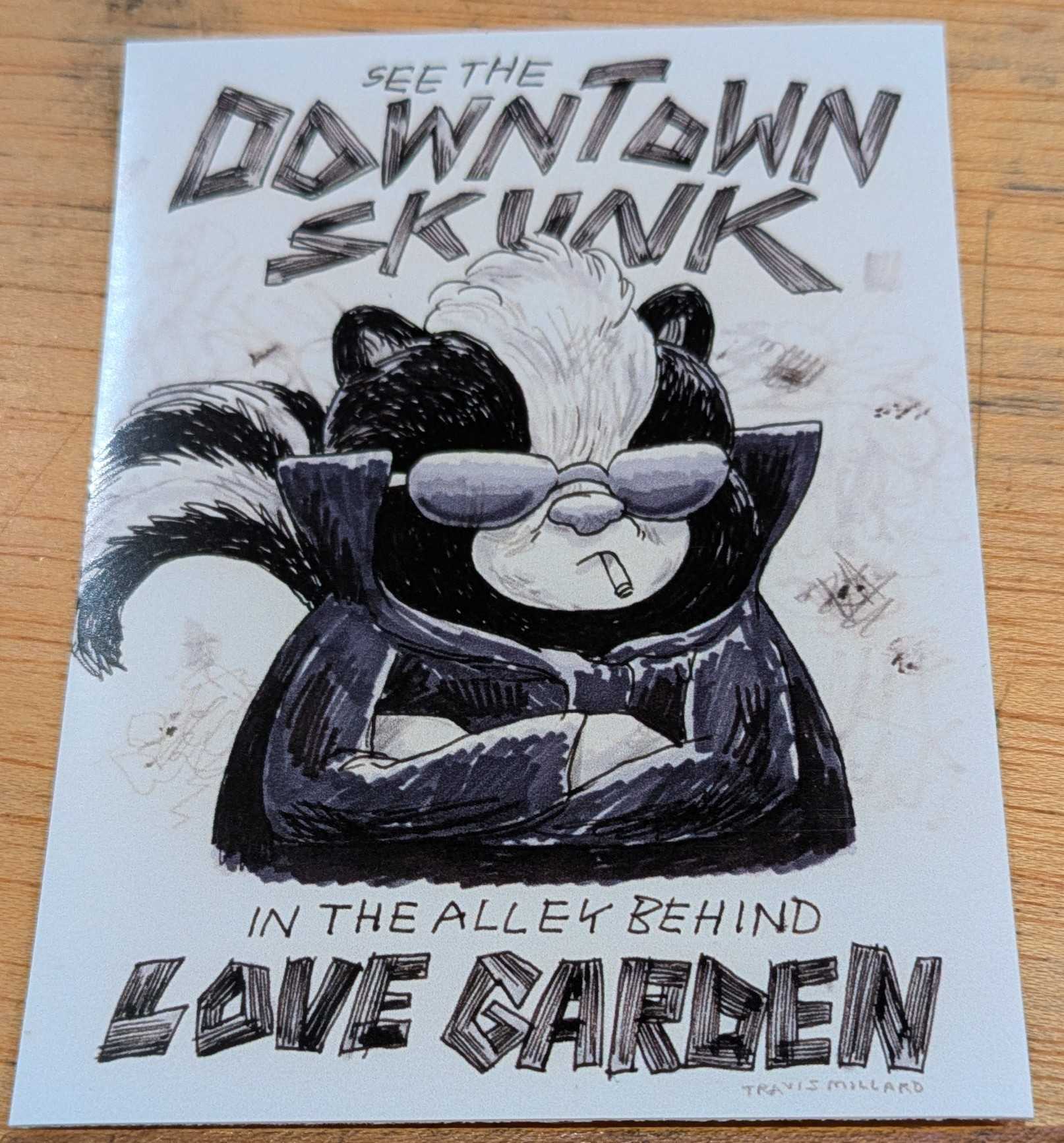 4" tall and 3" wide sticker featuring a portrait of the Downtown Skunk by Travis Millard.