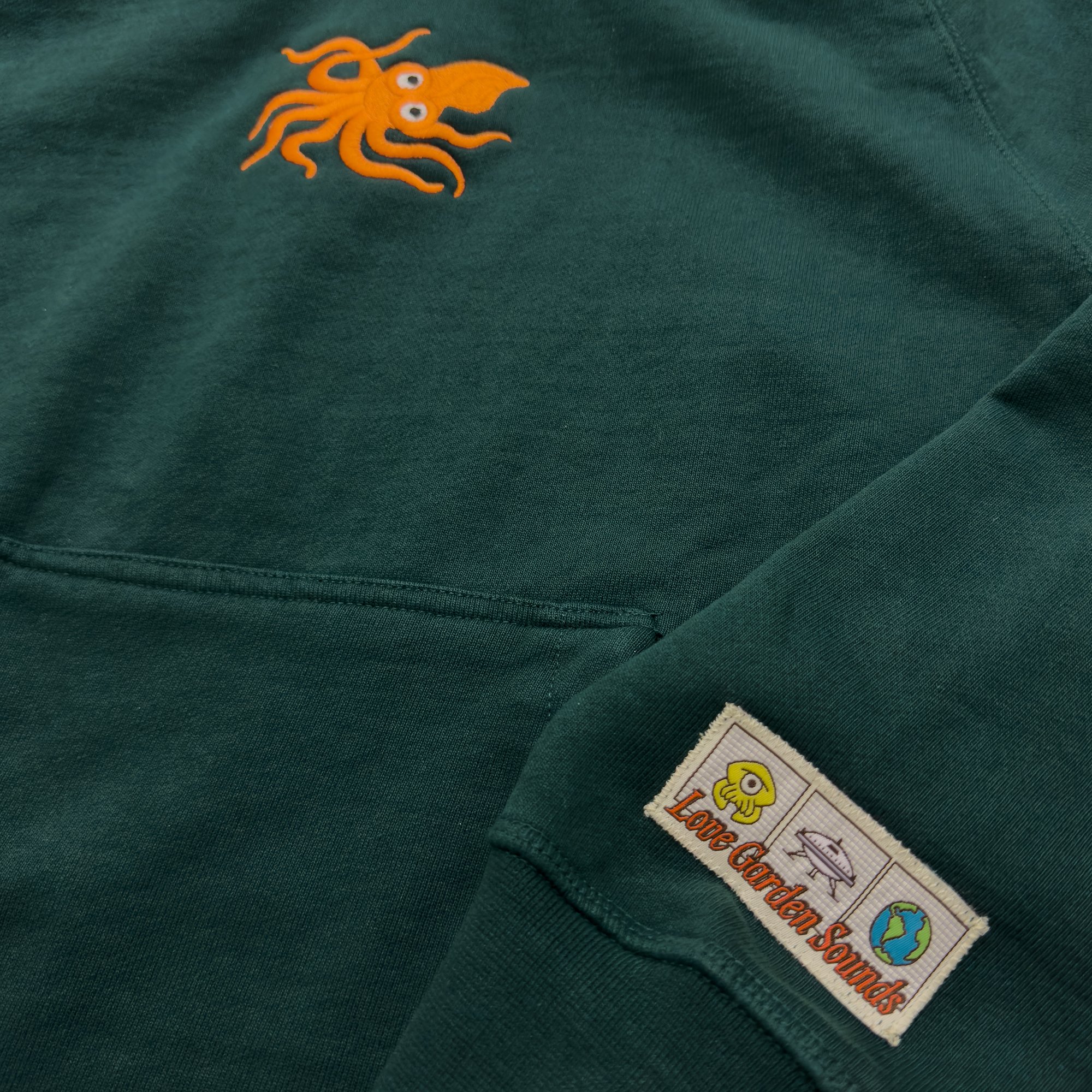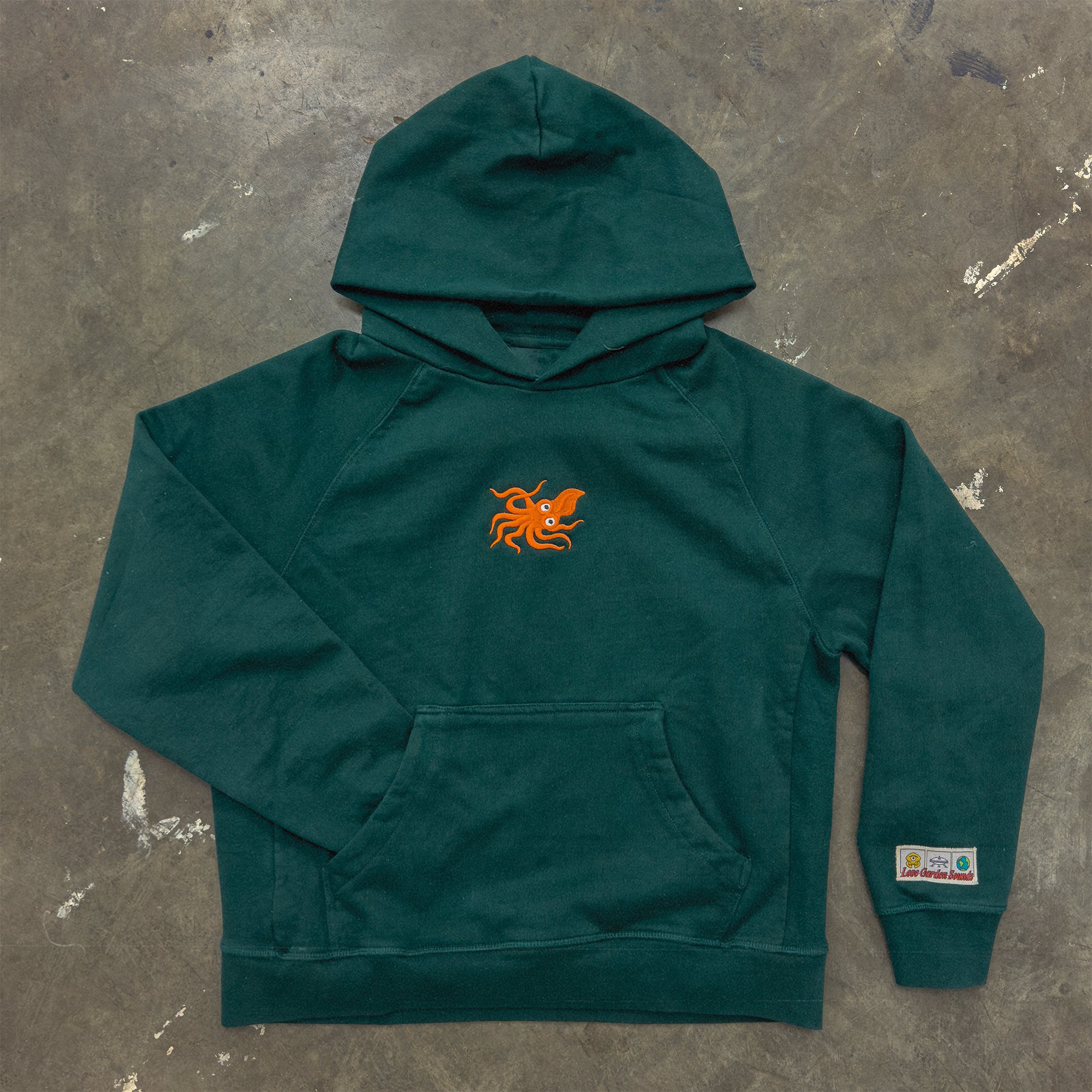 Original Favorites Brand Pine Ultra Heavyweight Organic French Terry Hoodie with a Centered Embroidered Squid and Cuff Accent Patch.